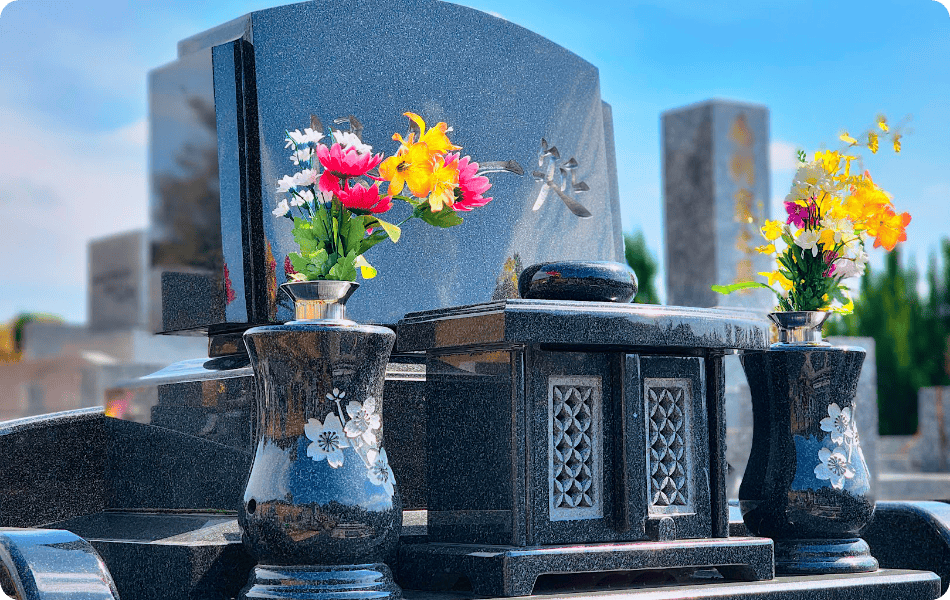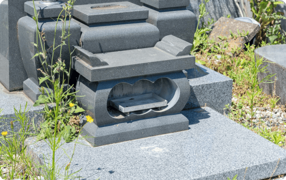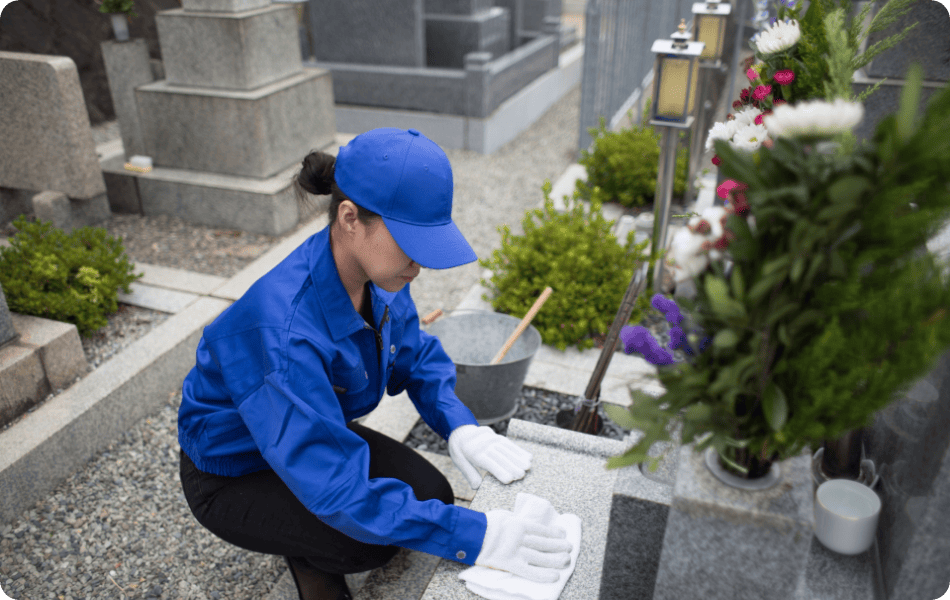 墓石に堆積した砂・ホコリの清掃、周りに生えた雑草を除去いたします。