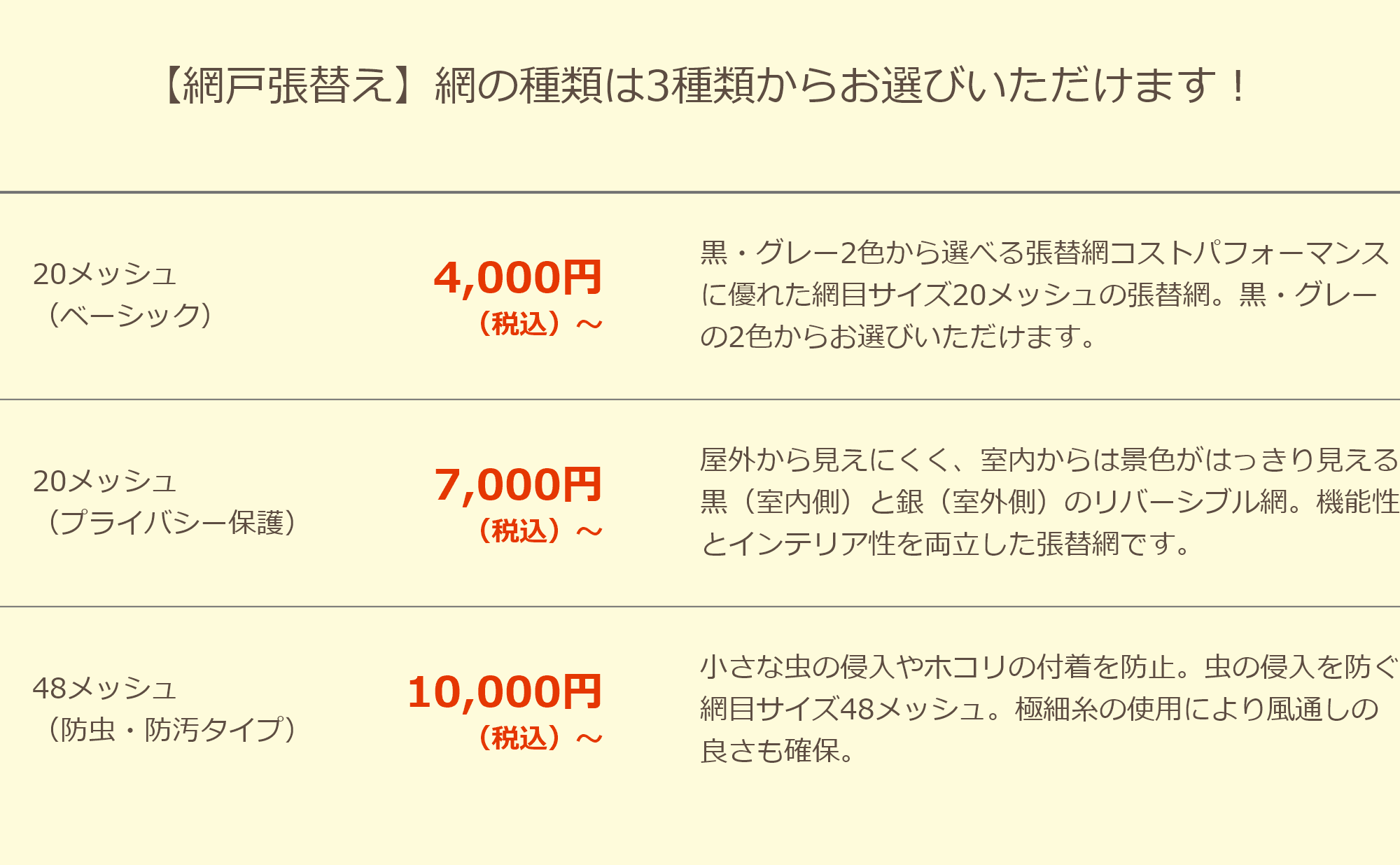 黒・グレー2色から選べる張替網コストパフォーマンスに優れた網目サイズ20メッシュの張替網。黒・グレーの2色からお選びいただけます。