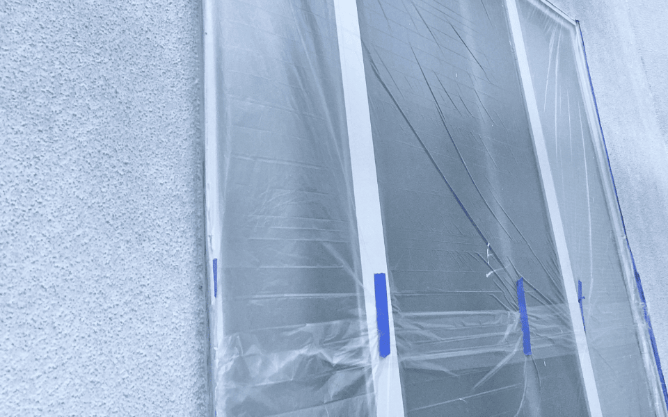 窓まわりの床に水や洗剤が飛び散らないよう養生シートで保護します。