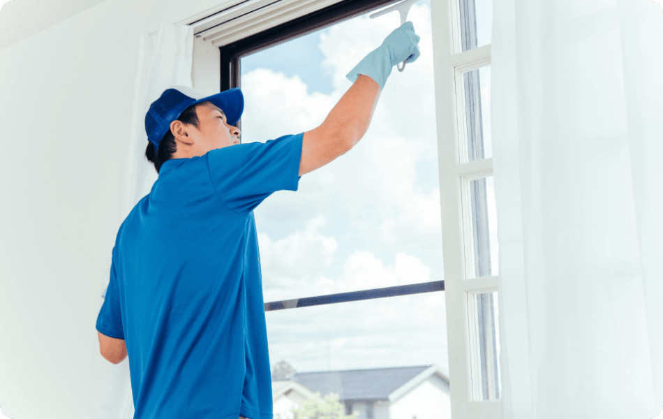窓ガラスの汚れ残りを両面からチェックし、残った汚れを除去します。